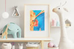 a whimsy, colorful doodle print of a cheeky bear in a tree slurping away at the honey