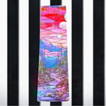 Crystalline mountains, stained glass style in pink and blue, with hand foiled accents, yes they are all different as I sat and hand foiled them all. On the rear large blue crystals against a pink sky in stained glass style with my little logo tucked away at the bottom.