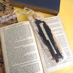 ~Bookmarks have a button stopper to stop you from losing it in your book. Logically like anything, if pushed hard enough could cause marks in the spine, so please use carefully, ie not rolled around in your bag where it runs the risk.