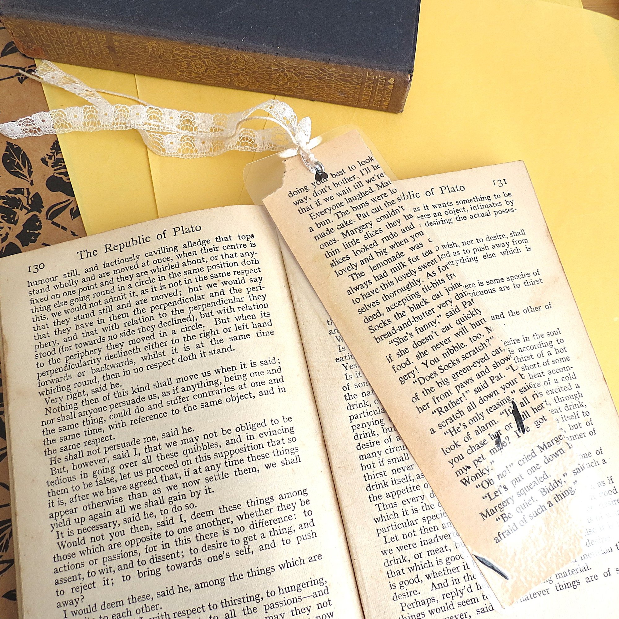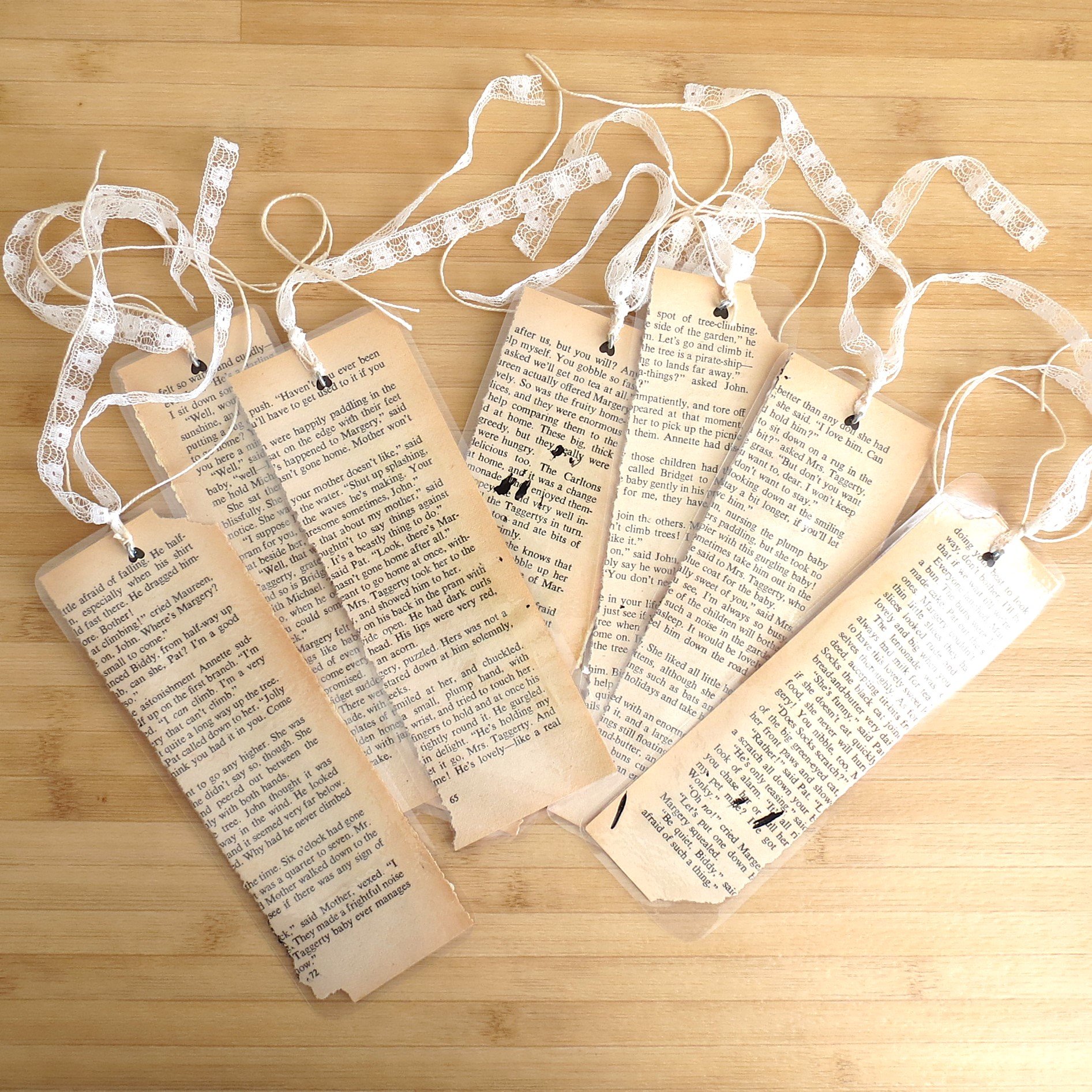 Handmade laminated bookmarks crafted from repurposed, damaged vintage children’s books, featuring eclectic quotes and vintage lace ribbon dangles with secure stoppers. Sized 7-8” x 2-3”, these unique page keepers are perfect for book lovers and vintage enthusiasts. Eco-friendly and one-of-a-kind, they make thoughtful gifts for readers seeking nostalgic, literary charm.