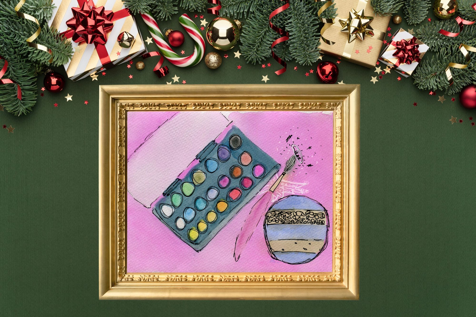 Pink Christmas Art Print: Watercolor Paint Set & Ornament