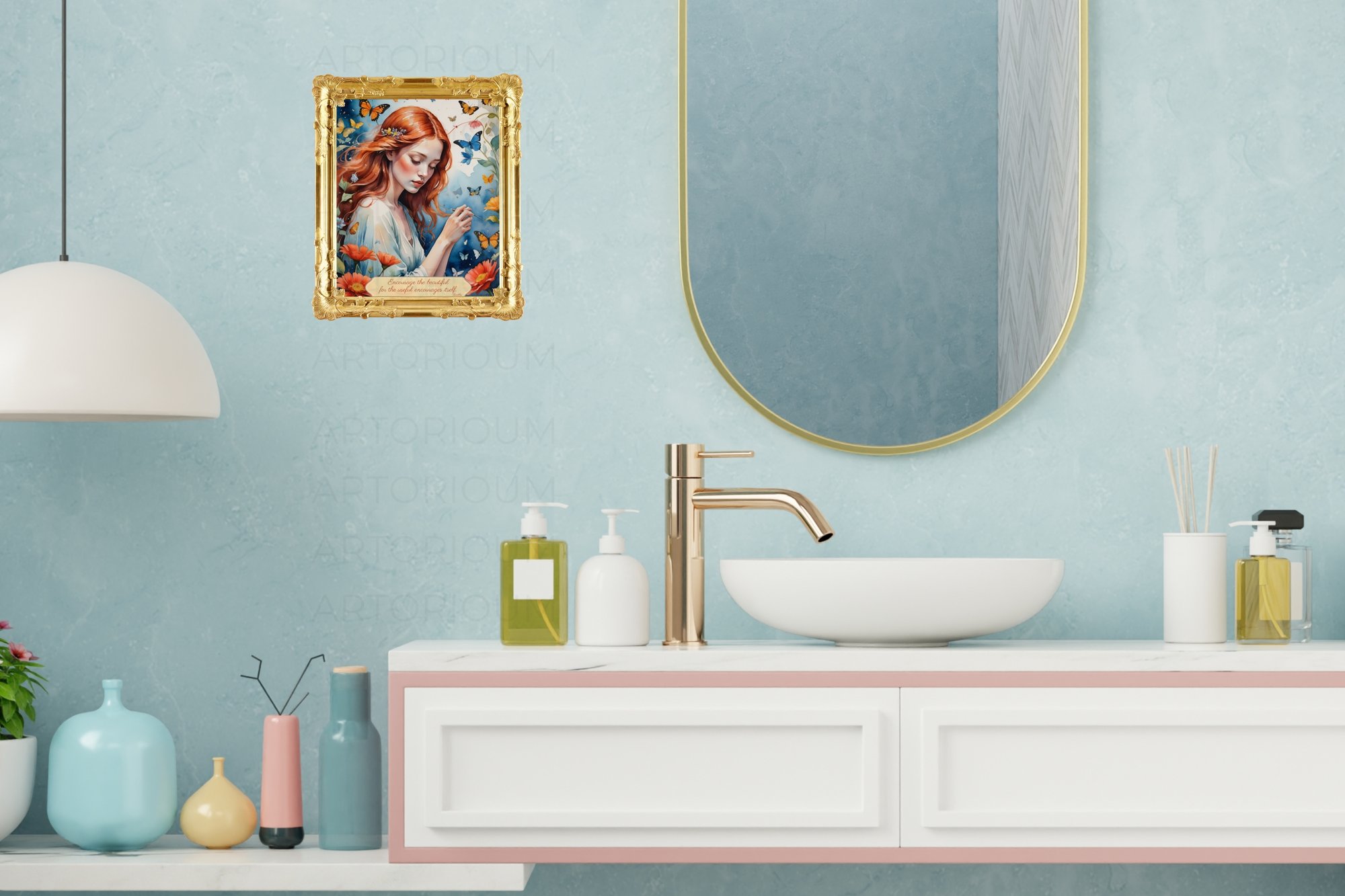 Red Hair Girl Art Print: Butterflies, Flowers, Goethe Quote
