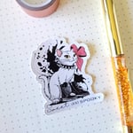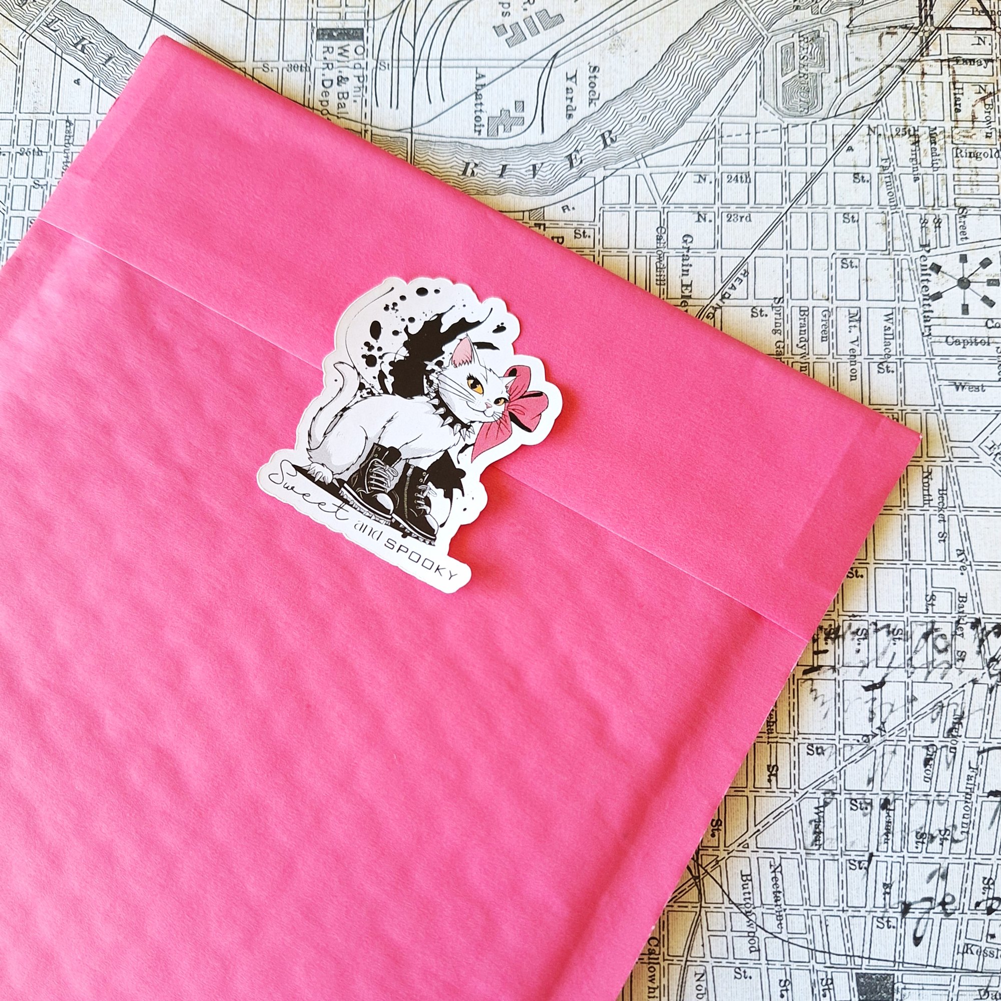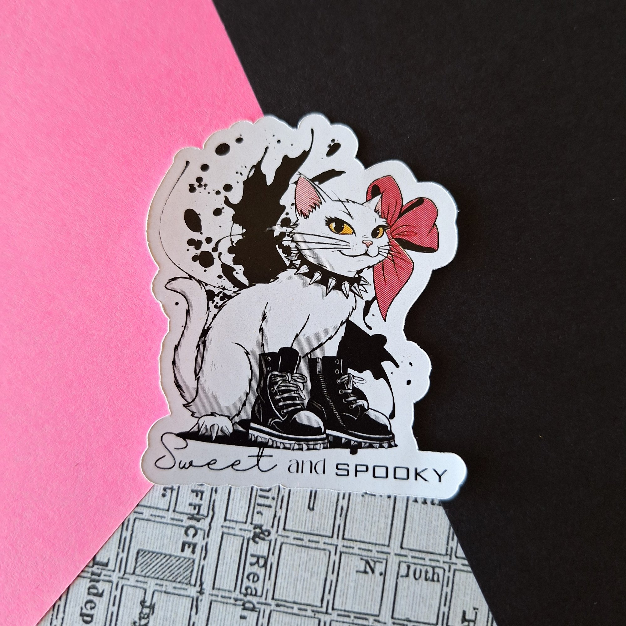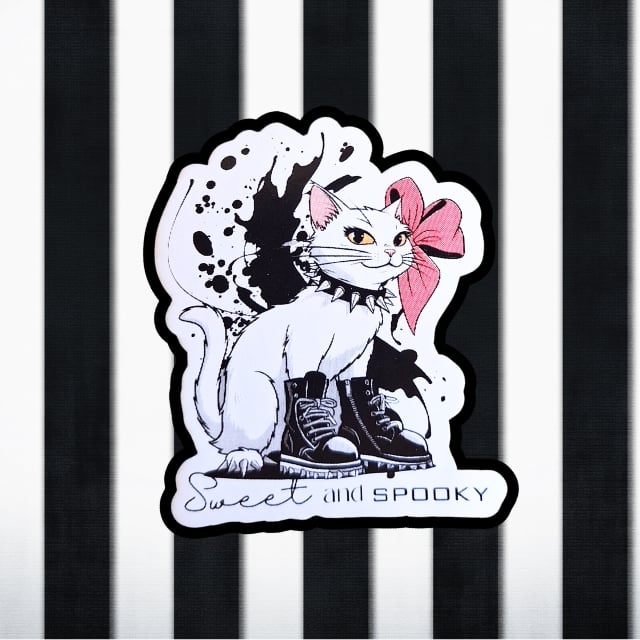 Just a little white kitty wearing some cool black boots and spike collar with a big pink bow, getting the balance right.